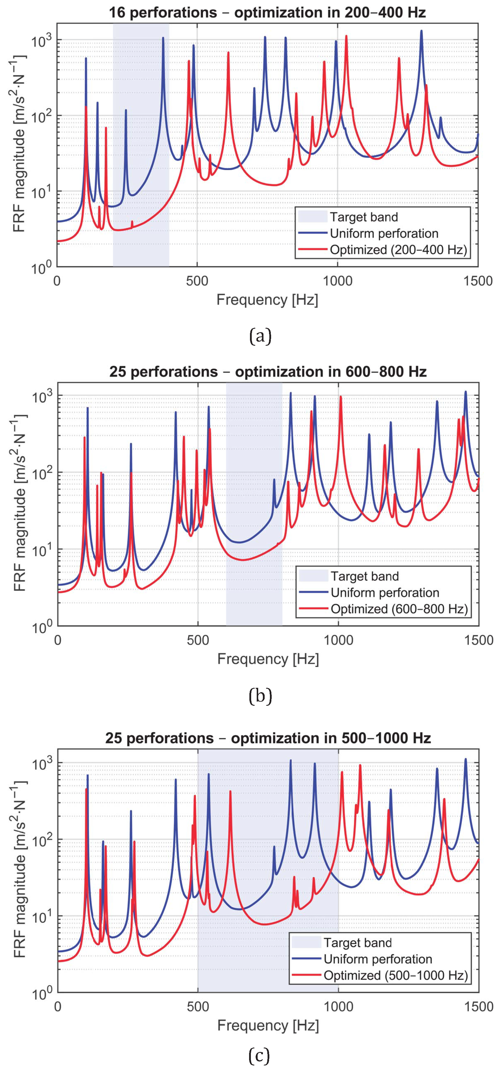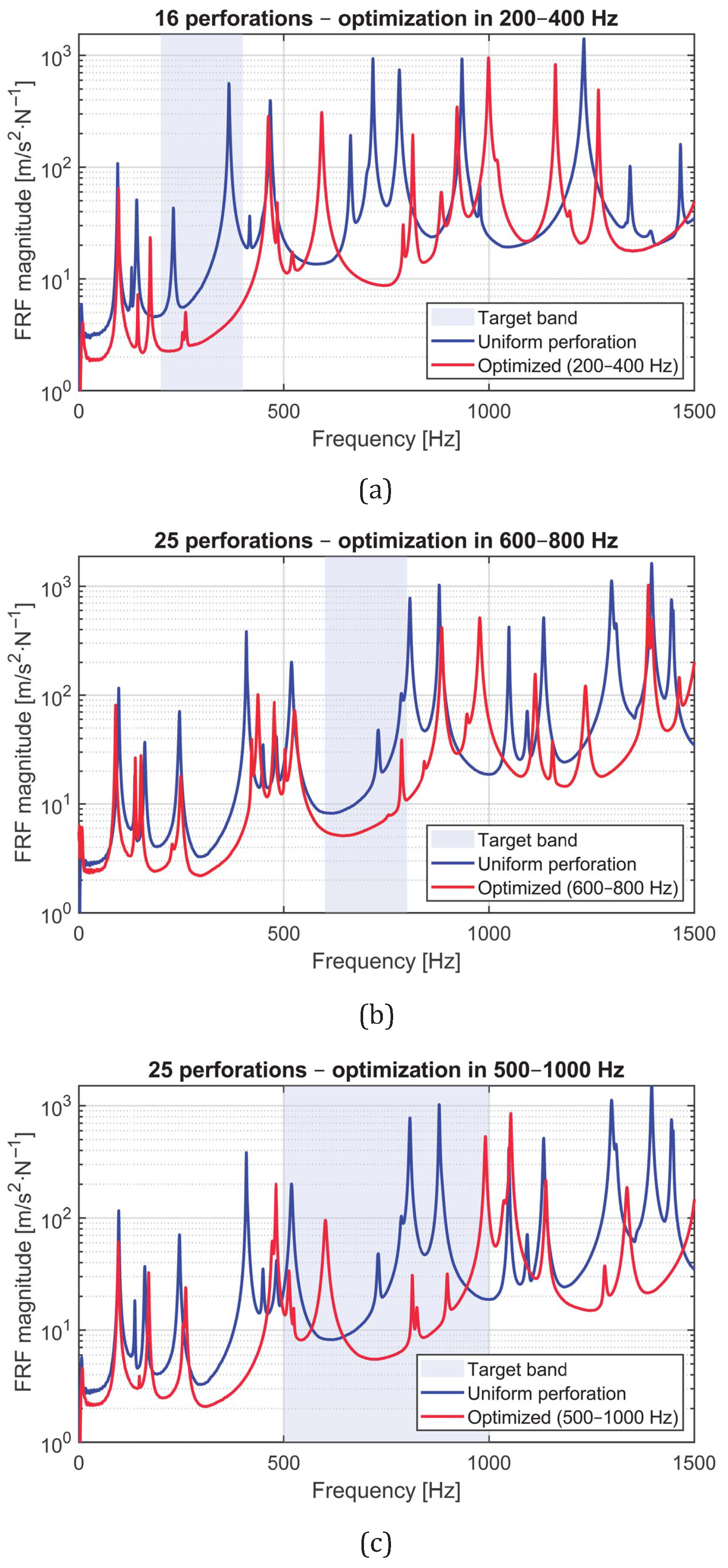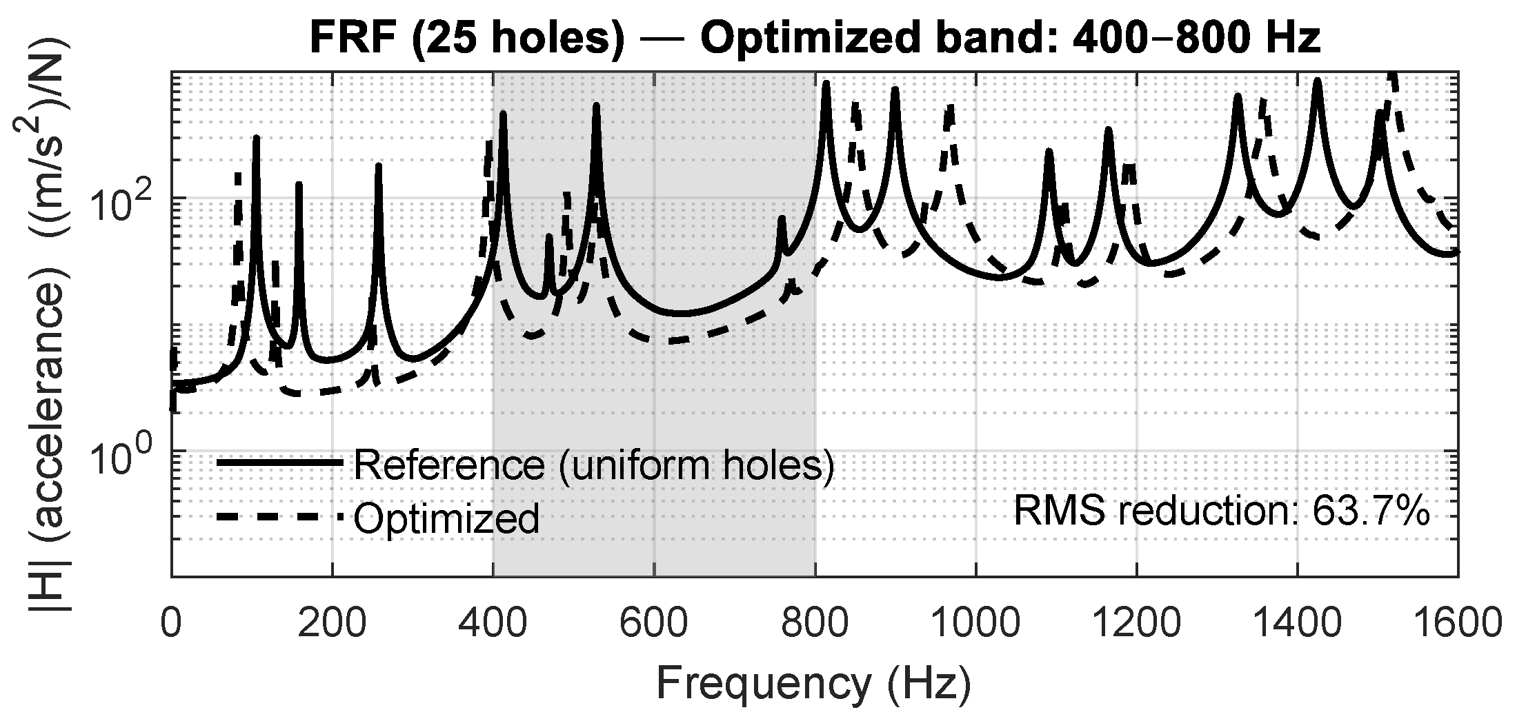 10)]. This objective reduces the average FRF magnitude over the entire target band, yielding frequency-selective attenuation that is robust to narrow spectral features in finite plates.