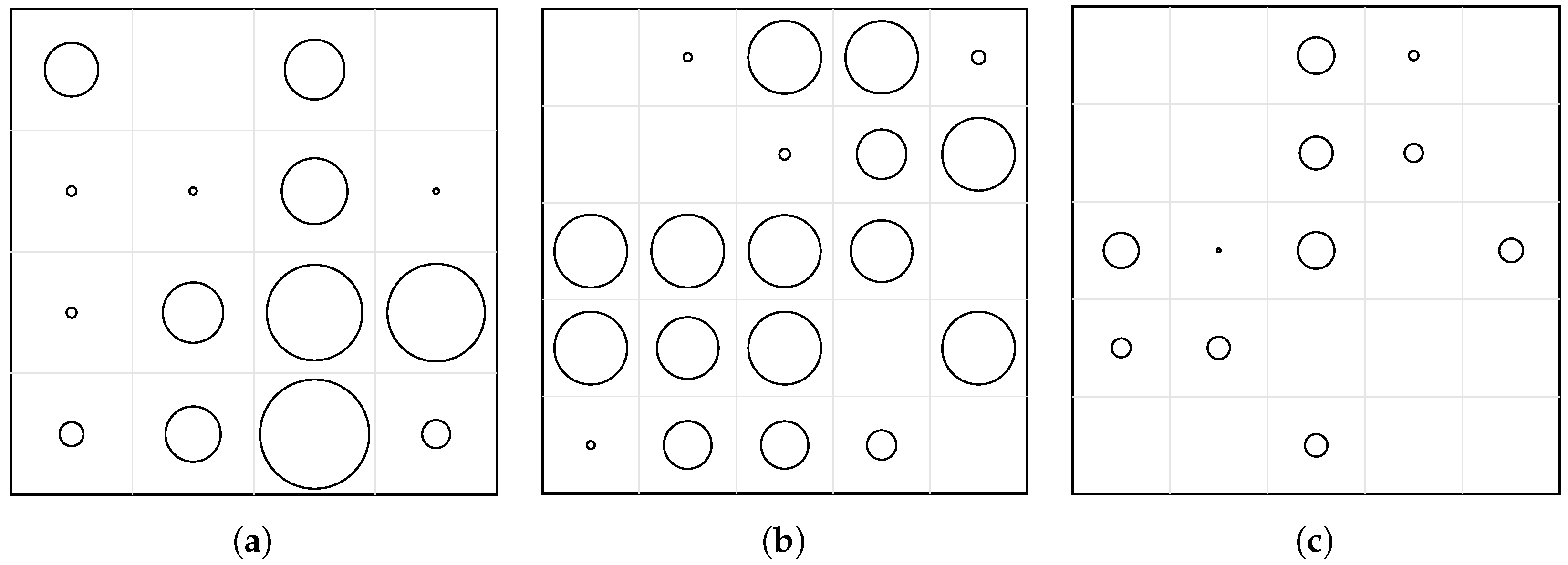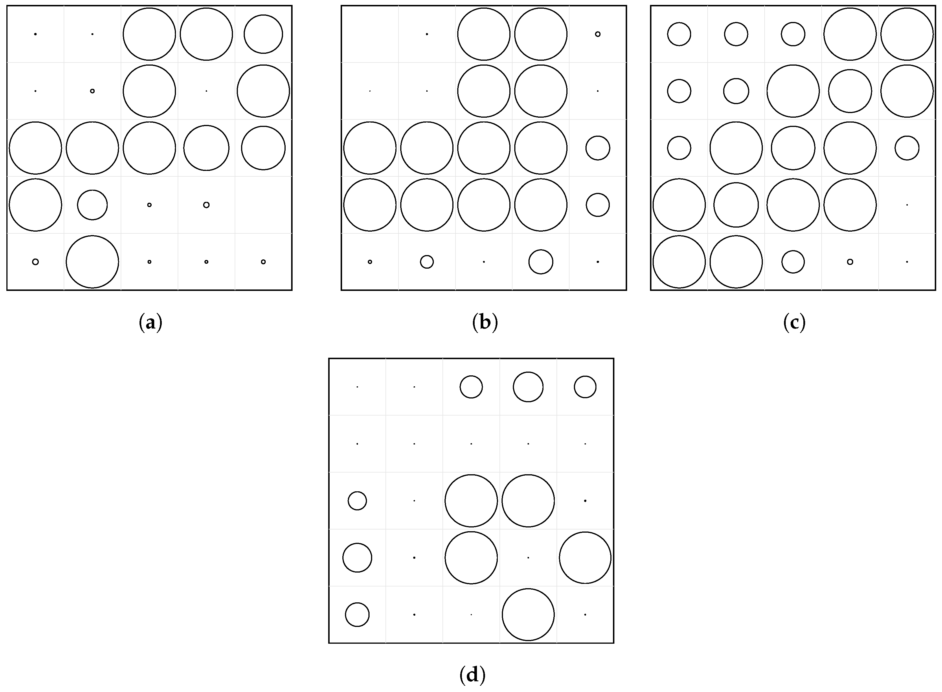 Figure 20) exhibit characteristic spatial patterns that depend on the target frequency band. In the low-frequency case (200–400 Hz, Case A), the algorithm favored larger perforations clustered toward one corner of the plate, with smaller holes or solid regions along the opposite diagonal. This asymmetry increases local flexibility in regions of high modal curvature, effectively shifting the first bending modes to higher frequencies. In the mid- and high-frequency cases (600–800 Hz and 500–1000 Hz, Cases B and C), the optimized patterns become more evenly distributed and show partial symmetry with respect to the plate diagonal. This quasi-symmetric arrangement results in a more balanced stiffness field, reducing modal coupling and ensuring attenuation across several higher-order modes.