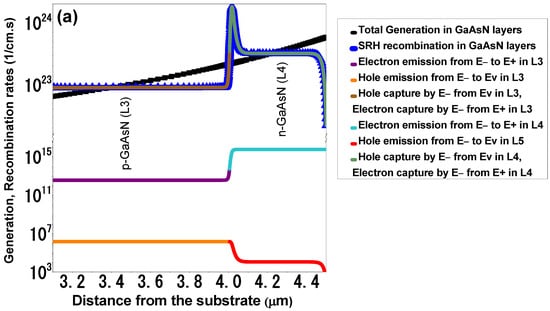 The results presented in Figure 7a,b illustrate transitions across three energy bands. The emission and capture of electrons and holes between these bands are depicted in the figures, alongside the total recombination processes governed by the Shockley-Read-Hall mechanism in HMAs.