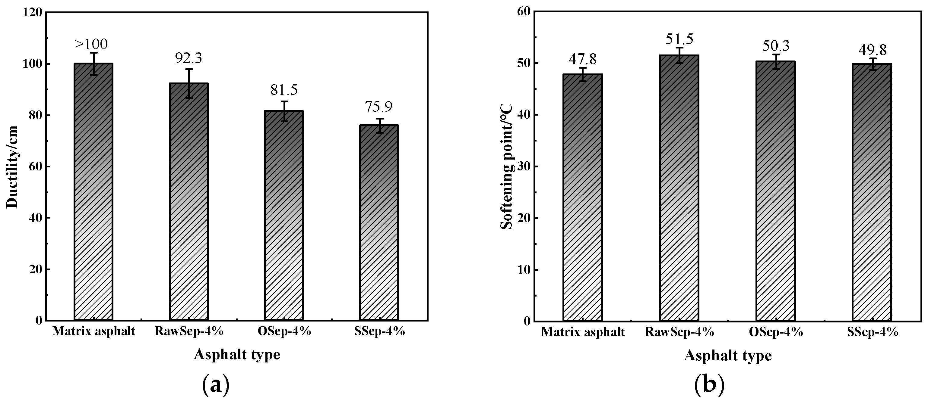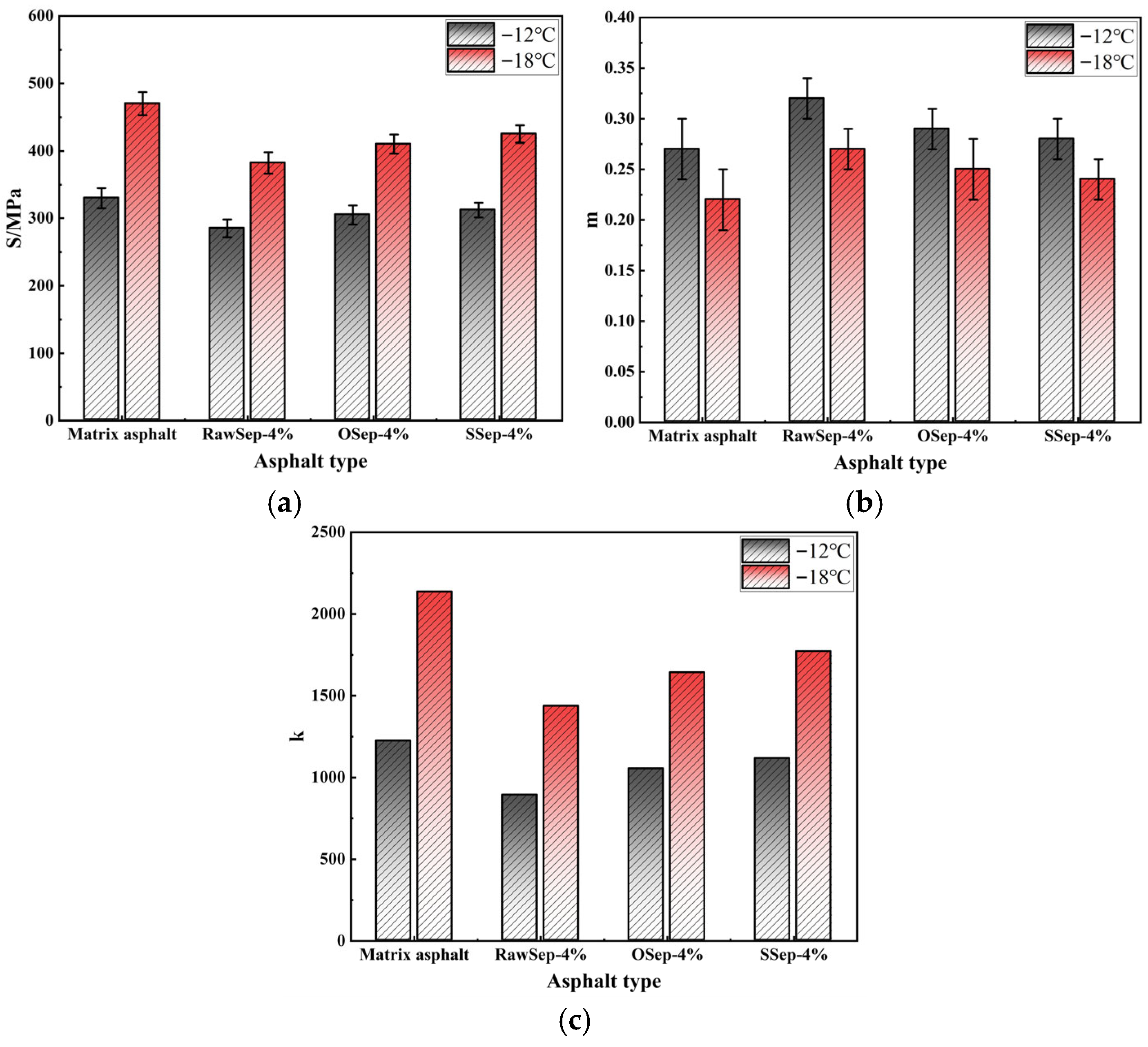 - RawSep exhibited the best compatibility with asphalt. Although the specific surface areas of OSep and SSep increased by 43–45% after modification, the high–low temperature coordination of the modified asphalt decreased by 10–15%, indicating that the optimization of sepiolite microstructure must be coupled with the compatibility of the asphalt matrix.