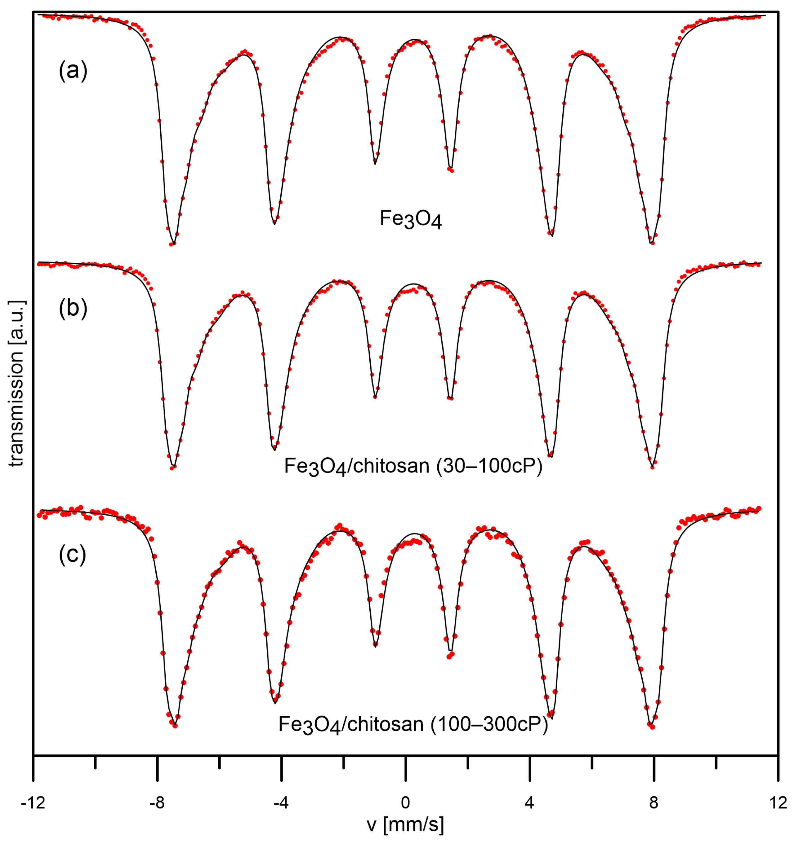 3.1. Preparation and Analysis of Properties of Fe3O4 and Fe3O4-Chitosan Composites