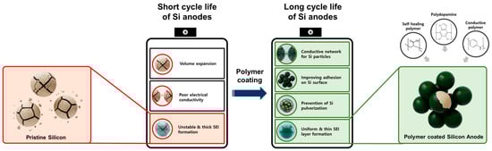 We hope this review will serve as a practical guideline for designing new polymer coating systems for Si-based LIB anodes by clarifying structure–process–performance relationships, defining realistic performance targets, and outlining manufacturable routes to device-level integration.