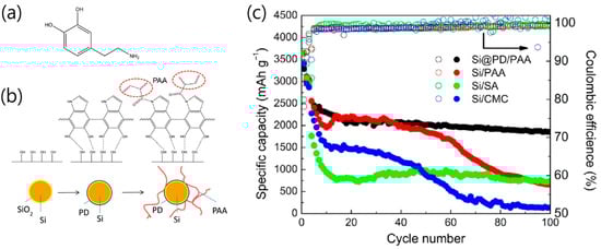 (a) Chemical structure of dopamine. (b) Graphical instruction of the interaction between different components. (c) Cycling performance of Si@PDA/PAA, Si/PAA, Si/sodium alginate (SA) and Si/CMC electrodes (reproduced with permission from [26], copyright 2016, ACS).