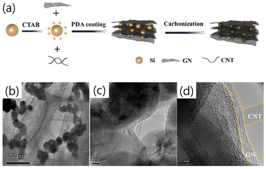 (a) Schematic of the synthesis route of C@Si/GN/CNT/PDA-C. (b–d) TEM images of C@Si/GN/CNT/PDA-C (reproduced with permission from [29], copyright 2022, ELSEVIER).