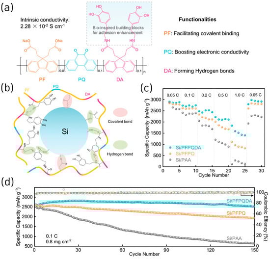 (a) Molecular structure of PFPQDA and the illustration of functionalities of each moiety in the monomeric unit. (b) Scheme of multiple networks constructed within Si/PFPQDA electrodes. (c) Rate performance of Si electrodes using different binders at a current density of 0.05 C, 0.1 C, 0.2 C, 0.5 C, and 1 C. (d) Cycling performance of Si electrodes using different binders at a current density of 0.1 C after five cycles at a rate of 0.05 C (reproduced with permission from [31], copyright 2022, Wiley-VCH GmbH).