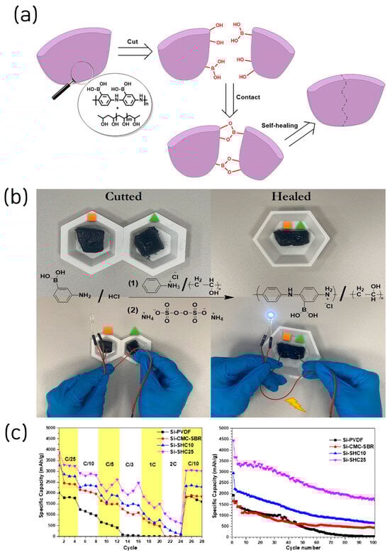 (a) Schematic representation of the self-healing mechanism of the SHC binder. (b) Illustration of the current flow test for cut and healed SHP. (c) Comparison of C-rate results, and galvanostatic charge/discharge test results (reproduced with permission from [40], copyright 2025, ACS).
