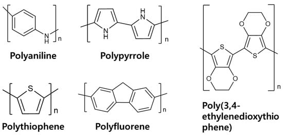 A LIB anode comprises not only lithium-storage active materials (graphite, silicon) but also conductive additives that establish percolated electron pathways and polymer binders that maintain particle cohesion and electrode integrity [41]. Consequently, the dual attributes of viscoelasticity and electrical conductivity make conductive polymers promising one-step replacements for conventional binders and carbon-based conductive additives. In line with this trend, a growing body of S-based LIB research has investigated the use of conductive polymers, including polyaniline, polypyrrole, polythiophene, polyfluorene, and poly(3,4-ethylenedioxythiiophene), as functional components of the anode architecture [42,43]. The chemical structure of the applied conductive polymers are provided in Figure 7. In this chapter, we survey conductive-polymer/Si hybrid configurations and evaluate their electrochemical behavior and practical implications.