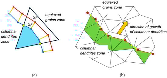 The main novelty of the EP-FT simulation model lies in tracking the envelope of columnar dendrite tips on a fixed control-volume unstructured mesh at the end of each subsequent calculation cycle of the transport processes conducted using the enthalpy–porosity (EP) model. This hypothetical interface of columnar dendrite tips is represented by a series of linear segments connected with massless markers, as shown in Figure 2a. An i-th marker’s initial location, , is known from the previous time step; the marker moves in the normal direction to the front towards the bulk liquid, according to the determined local undercooling, ΔT, and the assumed columnar dendrite growth law. The marker’s new position is determined as and a new shape of the front is obtained by the interpolation between new locations of the markers (red line segments in Figure 2a). In the presented calculations, the columnar dendrite tip velocity, Vtip, is assumed to be independent of the acceleration level and is determined using the Kurz–Giovanola–Trivedi law [38] and the least-square approximation to obtain for the further analyzed Pb-48wt.% Sn alloy.