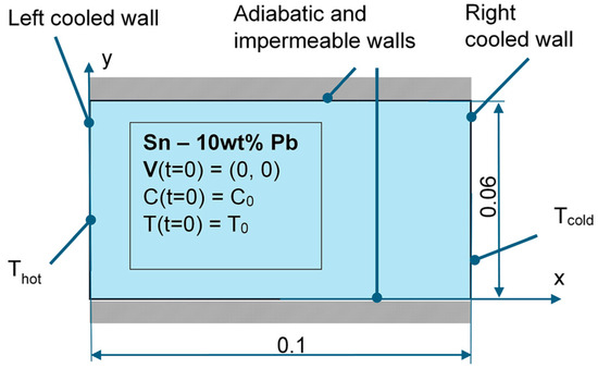 The schematic of the analyzed 2D cast is presented in Figure 4 along with the initial and boundary conditions. The impermeable, non-slip, and adiabatic boundary conditions are imposed on both horizontal walls. Both vertical walls are also treated as impermeable and non-slip interfaces, and the temperature boundary condition is defined there. In the AFRODITE experiment, the temperature of both vertical walls was maintained approximately constant for more than 500 s before the cooling stage.