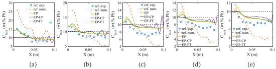 Cross-sections across the domain for the completely solidified cavity, determined at various elevations: (a) 1 cm; (b) 2 cm; (c) 3 cm; (d) 4 cm; (e) 5 cm; predicted with the EP, EP-CP and EP-FT models and compared to experimental (Hachani et al. [48]—blue dots) and numerical results (Zheng et al. [41]—dashed line). The black dashed line indicates the nominal composition value.
