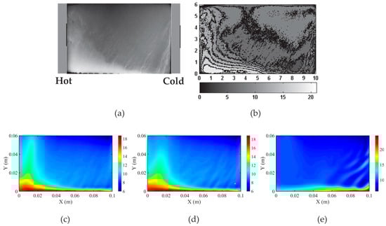Comparison of solute concentrations in the completely solidified alloy: (a) the X-radiography map of Pb concentration [49]; (b) its digitally processed picture [49]; (c) the EP; (d) the EP-FT; (e) the EP-CP (gs,coh = 0.3) calculations, respectively. (a,b) are reprinted from publication [49], with permission from Elsevier.