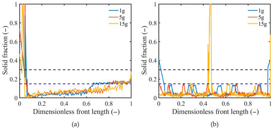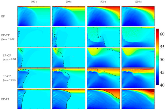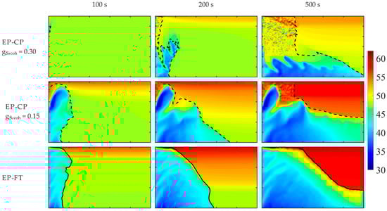 The example results are shown in Figure 10, where the evolving Sn concentration is presented for the selected case of β = 90° and the terrestrial gravity, reflecting Hebdich and Hunt’s experiment [46]. The front of columnar dendrite tips in the EP-FT calculations and the isoline of the solid fraction at the coherency point in the EP-CP predictions are presented with the solid and dashed lines, respectively. Both lines split the domain into the columnar porous zone, on the cavity’s cooled wall side, and the solid grains’ slurry, in the hotter region.