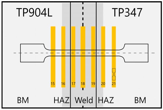 Miniaturized tensile tests were performed using a TiraTest universal testing machine (TIRA GmbH, Schalkau, Germany) with a loading capacity of 10 kN. Specimens were extracted from characteristic regions of the joints using WEDM, according to the schematics shown in Figure 1 and Figure 3. Deformation was recorded using a Mercury RT virtual extensometer (SOBRIETY s.r.o., Kuřim, Czech Republic) calibrated in 2D mode with a single camera. The initial gauge length of the virtual extensometer for sub-sized specimens was set to 4 mm. All the specimens were tested under quasi-static conditions at a strain rate of 0.00025 s−1 (0.07 mm/min) at room temperature.