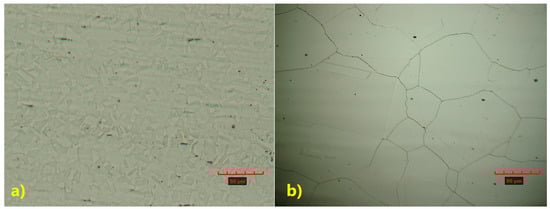 Metallographic structure analysis was performed using an optical microscope and a scanning electron microscope (SEM). Both welded stainless steels exhibit an austenitic microstructure; however, clear differences in grain size are observed (Figure 5).