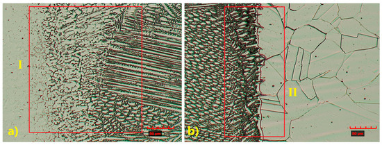 The microstructure of the HAZ in the TP347 steel is more complex, with evident grain refinement observed (Figure 7—I). In TP904L steel, the HAZ was difficult to precisely identify due to limited ferrite transformation, with microstructural changes occurring primarily along the fusion line (Figure 7—II) [32].