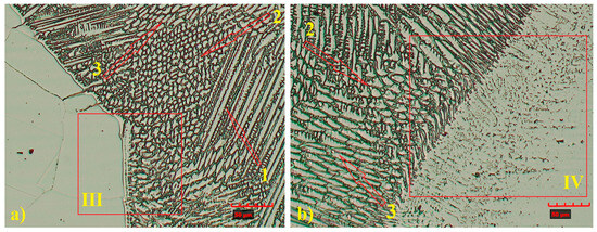 The weld microstructure near the fusion line consisted of cellular (region 2), equiaxed (region 3) and pillar (region 1) dendrites arranged in bands. Longer pillar dendrites are observed on the TP904L steel side (Figure 10 and Figure 11). In the joint welded with filler, a tendency for dendrite growth toward the top of the weld was observed. In the joint without filler, the dendrites’ growth direction was a combination of orientations, toward the weld axis, perpendicular to it, and toward the weld top. Magnified areas provide a detailed view of the weld microstructure (Figure 11), which corresponds well with the global observations obtained from the macrostructure images.