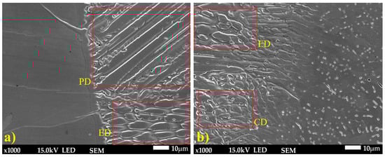 Optical and SEM analyses (Figure 7 and Figure 8) revealed a complex weld microstructure along the fusion line, consisting of pillar (PD), cellular (CD), and equiaxed (ED) dendrites identified based on their geometry and growth orientation. In addition, several precipitates, most likely Cr23C6, caused by Cr segregation during rapid solidification, were observed in the HAZ and weld of TP904L steel near the fusion line (Figure 8b—red arrows) [18]. This side of the weld consisted primarily of pillar and equiaxed dendrites, with a small fraction of cellular dendrites. On the TP347 steel side, the weld microstructure contained all three types of dendrites; however, pillar dendrites were present in the smallest proportion (Figure 8a). The dendrites’ growth direction was perpendicular to the weld axis.