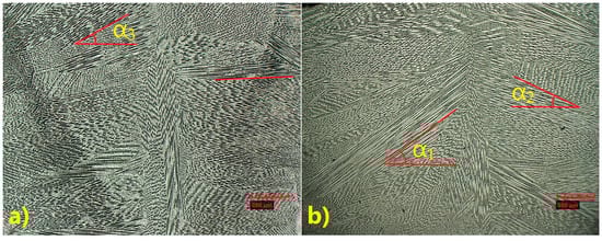 The microstructure observed along the weld axis confirmed the direction of crystallization toward the top of the weld in the joint welded with filler (Figure 12b), whereas in the joint without filler, a tendency to crystallize perpendicular to the weld axis, combined with upward growth, was observed (Figure 12a). The measured growth angles of the pillar dendrites in the first weld (without filler) ranged between 0° and α3 = 30°, while in the second weld (with fillet metal), they were typically between α2 = 30° and α1 = 45°.