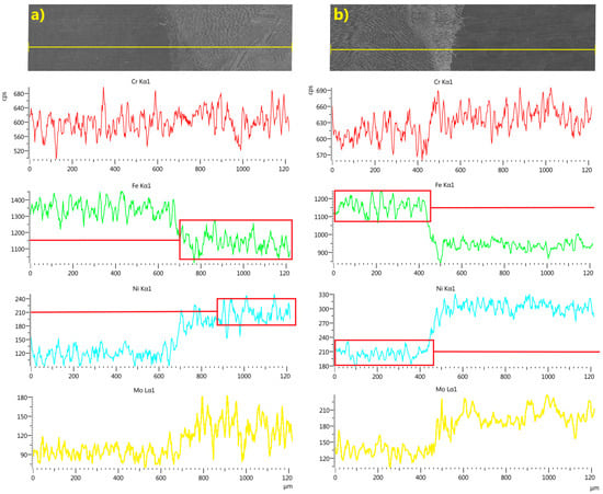 Linear EDS analyses of chromium, iron, nickel and molybdenum across the weld line in LBW joints with 309L filler: (a) weld, side of TP347, (b) weld, side of TP904L with graphic box/line presentation of variation and average distribution value in weld.