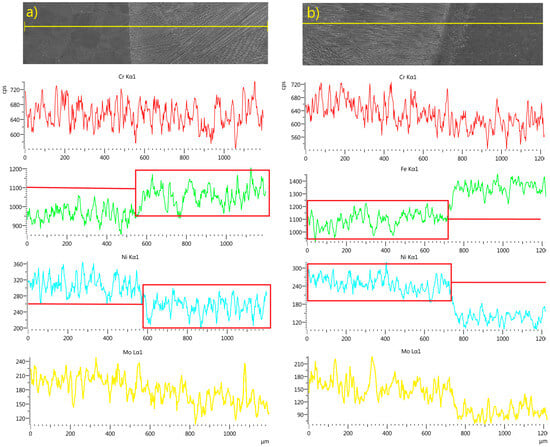 EDS linear and map analyses confirmed a uniform distribution of alloying elements within the welds, indicating a high degree of mixing (Figure 14, Figure 15, Figure 16 and Figure 17). The chromium distribution in the joint cross-section is homogeneous, while molybdenum exhibits smoother compositional transitions in the weld produced with filler material (Figure 16) compared to the weld made without filler (Figure 14). More pronounced variations were observed in the distributions of iron and nickel; the higher iron content in TP347 compared to TP904L resulted in a stepwise transition at the weld interface. In the weld, the iron concentration was lower in the joint with 309L filler, whereas the nickel concentration was higher. This compositional shift—characterized by reduced iron and increased nickel content—enhances both corrosion resistance and mechanical performance [38].
