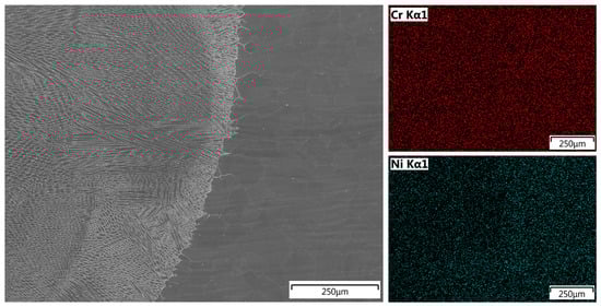 EDS line scan analysis showed a uniform distribution of chromium along the measurement line, with a slightly higher concentration in the TP904L base material. The uniform distribution of the main alloying elements—nickel, iron, and molybdenum—indicates a high mixing factor (Figure 14), which was further confirmed by chromium and nickel mapping analyses (Figure 15). The measured concentrations in the weld cross-section were within the range of the nominal composition of the base materials.