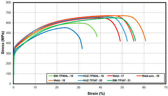 Engineering stress–strain curves of the miniaturized tensile test of the laser-welded TP904L-TP347 joint without filler.