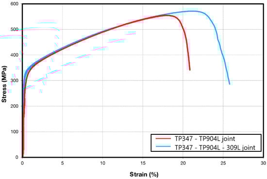 Greater differences were observed in the second joint, where 309L filler was used. The measured strength and elongation of the base materials TP347 and TP904L were similar to the value obtained from the first specimen—up to 700 MPa with 50% elongation for TP347 (21), and 590 MPa with 46% elongation for TP904L(15).