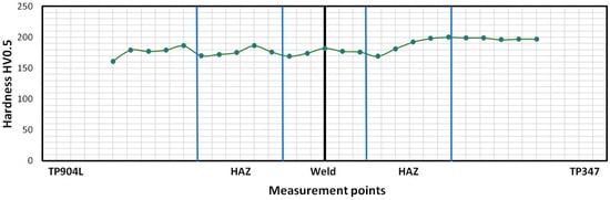 Hardness distribution of laser-welded TP904L-TP347 joints without filler material.