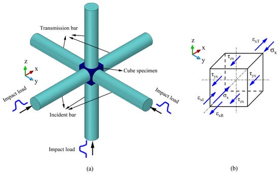 The conventional Split Hopkinson Pressure Bar (SHPB) apparatus is designed to investigate the dynamic mechanical properties of materials under a one-dimensional stress assumption. However, when materials are subjected to multi-axial impact loading, it becomes essential to study their behavior under multi-dimensional dynamic conditions. As illustrated in Figure 2a, a cubic specimen is placed in contact with six pressure bars—forming a three-dimensional orthogonal system—where three mutually perpendicular bars serve as incident bars, and the opposite three function as transmission bars.
