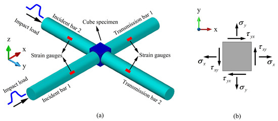 The preceding section presented the theoretical derivation for materials under three-dimensional impact loading. If the material is subjected to two-dimensional impact loading, as illustrated in Figure 3a, the cubic specimen is positioned within a two-dimensional orthogonal system consisting of two transmission bars and two incident bars. The specimen is impacted along the x- and y-directions, and a schematic of the stress state is shown in Figure 3b, where the stress in the z-direction is assumed to be zero. Based on Equations (5) and (6), the dynamic response of the material under biaxial impact loading can be derived as [5]: