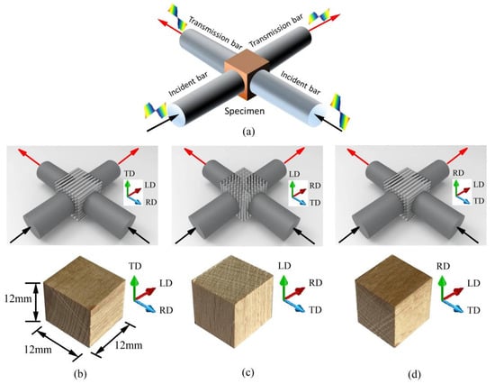 (a) Schematic diagram of biaxial impact test, (b) Beech wood specimen under radial and longitudinal loading, (c) Beech wood specimen under radial and tangential loading, and (d) Beech wood specimen under longitudinal and tangential loading [5].