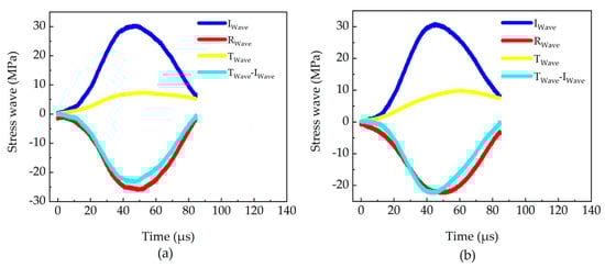 As shown in Figure 6b, the two incident waves were initiated simultaneously and exhibited identical amplitudes, confirming the simultaneity of stress wave generation and satisfying the experimental requirements for synchronized wave loading. The transmitted waves displayed similar temporal trends but differing amplitudes, a characteristic also observed in the reflected waves. Notably, while the transmitted wave reached higher amplitudes in the radial direction, the reflected wave showed preferential amplification in the tangential direction. This directional dependence directly results from the fundamental differences in beech wood’s physical characteristics along these two principal orientations.