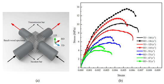 By applying impact loading simultaneously along the tangential and radial directions of beech specimens (Figure 9a) [5], stress wave signals were captured using strain gauges mounted on the pressure bars, yielding the stress–strain curves shown in Figure 9b [5]. The results demonstrate that with increasing strain rate, both the stress amplitude and corresponding strain values increase in both the tangential and radial directions, confirming the presence of a significant strain rate effect in both material orientations. Notably, under identical testing conditions, the radial direction exhibits higher stress amplitude but lower strain values, with a correspondingly lower strain rate compared to the tangential direction.