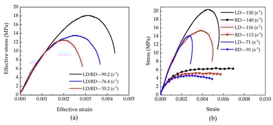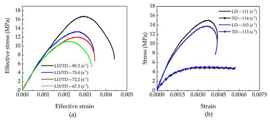From the experimental stress–strain curves of each test group, equivalent stress–strain curves were developed. As depicted in Figure 10a [5], the equivalent ultimate strength of beech increases with the equivalent strain rate, accompanied by a corresponding rise in equivalent strain. Figure 10b compares two representative sets of tests with similar radial strain rates: while their radial stress–strain curves are essentially consistent, notable differences appear in the tangential responses. Specifically, both the tangential stress amplitude and strain values increase with rising tangential strain rates.