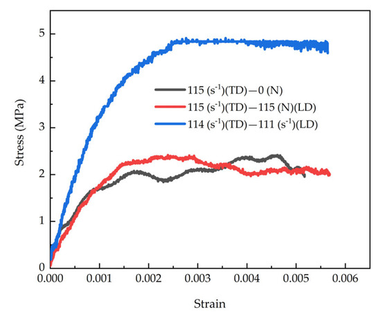 Figure 15 presents a comparative analysis of stress–strain curves under three different loading conditions, including: uniaxial impact loading in the tangential direction, uniaxial impact loading in the tangential direction with longitudinal lateral confinement, and biaxial impact loading in both tangential and longitudinal directions. Data analysis reveals that at a constant strain rate, the stress–strain curve’s shape and evolution are governed by the lateral confinement conditions. Under biaxial impact, the tangential deformation was markedly greater than the longitudinal deformation. Moreover, the longitudinal impact further amplifies the tangential deformation, leading to a significant increase in tangential stress. Consequently, the tangential stress amplitude under biaxial impact loading is higher than that under the other two loading conditions. These results fully demonstrate that the dynamic mechanical behavior of the specimen is influenced not only by the strain rate but also significantly constrained by lateral confinement conditions and multi-axial stress states.