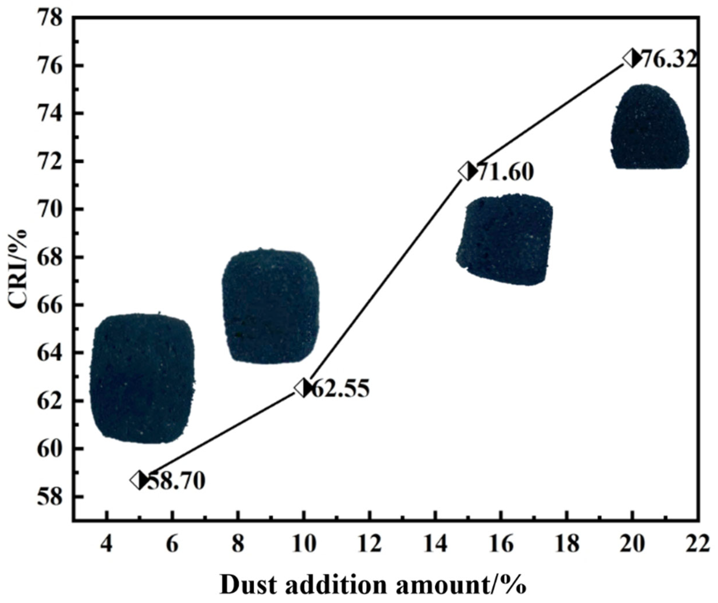 - Increasing the ICD addition elevates the CRI of ferro-coke. As the ICD addition increases from 5% to 20%, the CRI rises from 58.70% to 76.32%, while the high-temperature strength of ferro-coke after gasification decreases from 3260 N to 1954 N at 800 °C. Iron and zinc in the dust catalyze gasification, intensify internal erosion, and thereby reduce high-temperature strength.