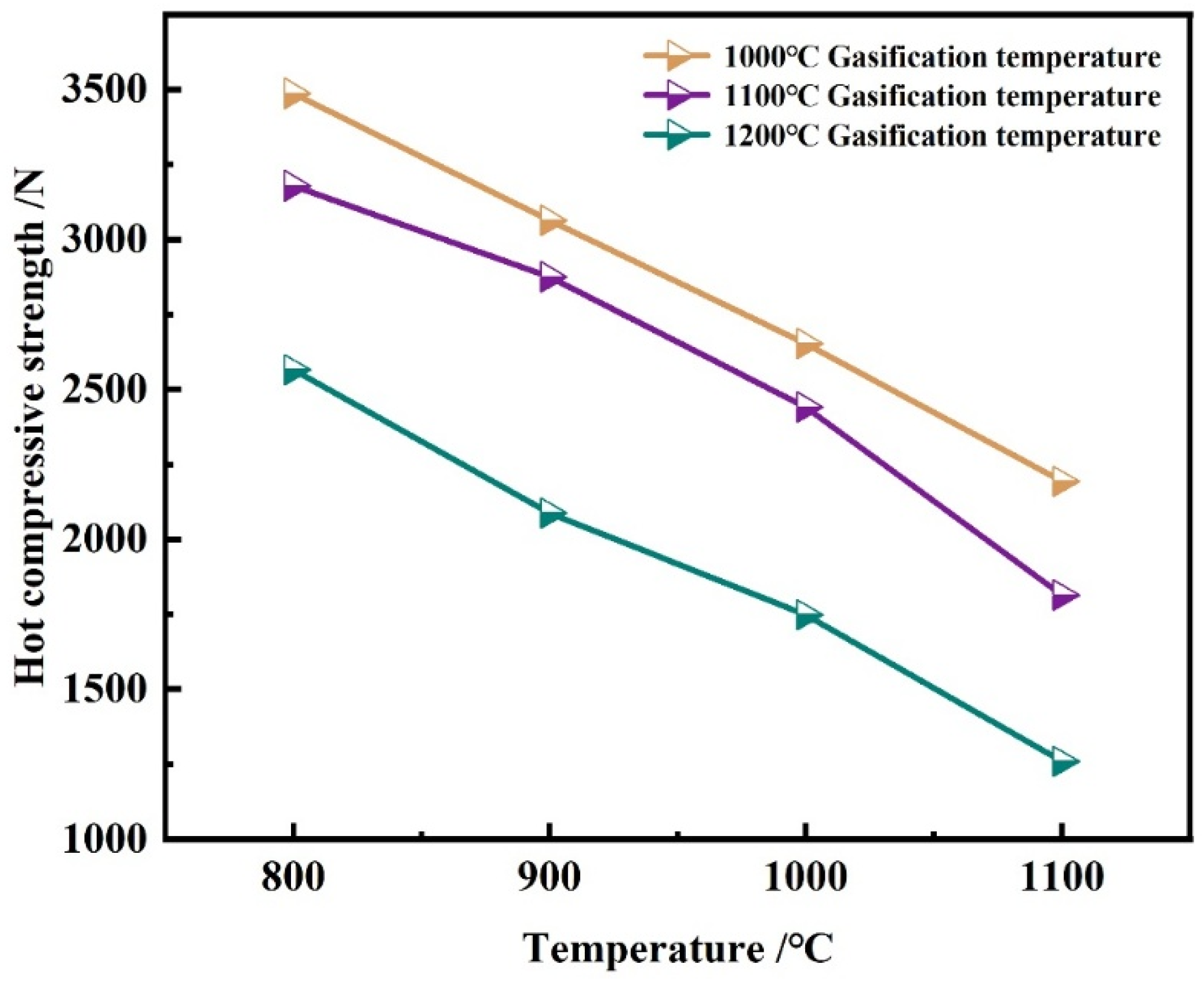 - Increasing the gasification temperature also raises CRI. When the gasification temperature increases from 1000 °C to 1200 °C, the CRI increases from 51.95% to 65.51%, accompanied by a decrease in high-temperature strength. Higher gasification temperatures enhance reactivity, increase porosity, and diminish the high-temperature strength.