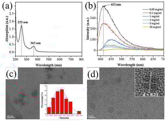 Figure 1a). These features indicate that the CDs possess a partially graphitized crystalline core alongside oxygen-containing functional groups (e.g., C=O, –OH), which generate surface states with a continuous energy distribution, enabling broad-band absorption from the ultraviolet to visible region. Fluorescence spectra showed that the fluorescence intensity of the CDs decreased with increasing concentration, suggesting fluorescence quenching due to aggregation at high concentrations (
