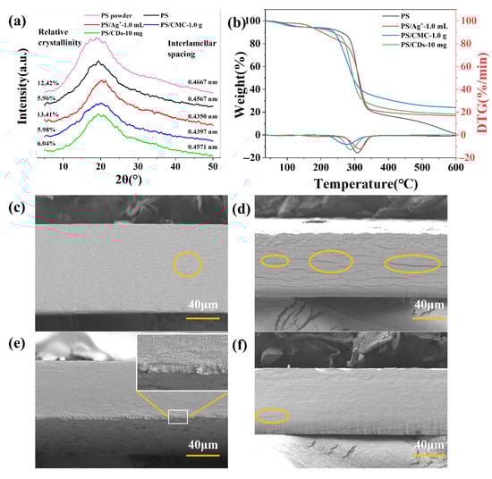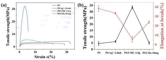 Figure 2a), resulting from electrostatic interactions and hydrogen bonding between CMC and PS chains that form a compact interpenetrating network. This structure improves stress transfer efficiency but severely limits chain slippage. In contrast, the PS/CDs composite achieved a balanced mechanical performance, with a tensile strength of 5.1 MPa and an elongation at break of 24.1% (