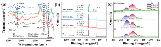 Figure 3c), resulting from the incorporation of carboxyl and ether groups from CMC molecules. In contrast, the PS/CDs composite exhibited a significant increase in C–O content from 67.11% to 72.99%, accompanied by decreases in both C–C and C=O contents. This trend reflects the dominant role of oxygen-rich functional groups (e.g., hydroxyl and epoxy groups) on the carbon dot surfaces in shaping the interfacial chemical environment, leading to the formation of a dense hydrogen-bonding network with PS.