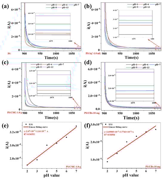 R2) of 0.9655 for PS/CMC and 0.9450 for PS/CDs, demonstrating that the current signal reliably tracks pH variations. This pH-responsive behavior is attributed to the protonation–deprotonation equilibrium of surface functional groups (e.g., carboxyl and hydroxyl) [
