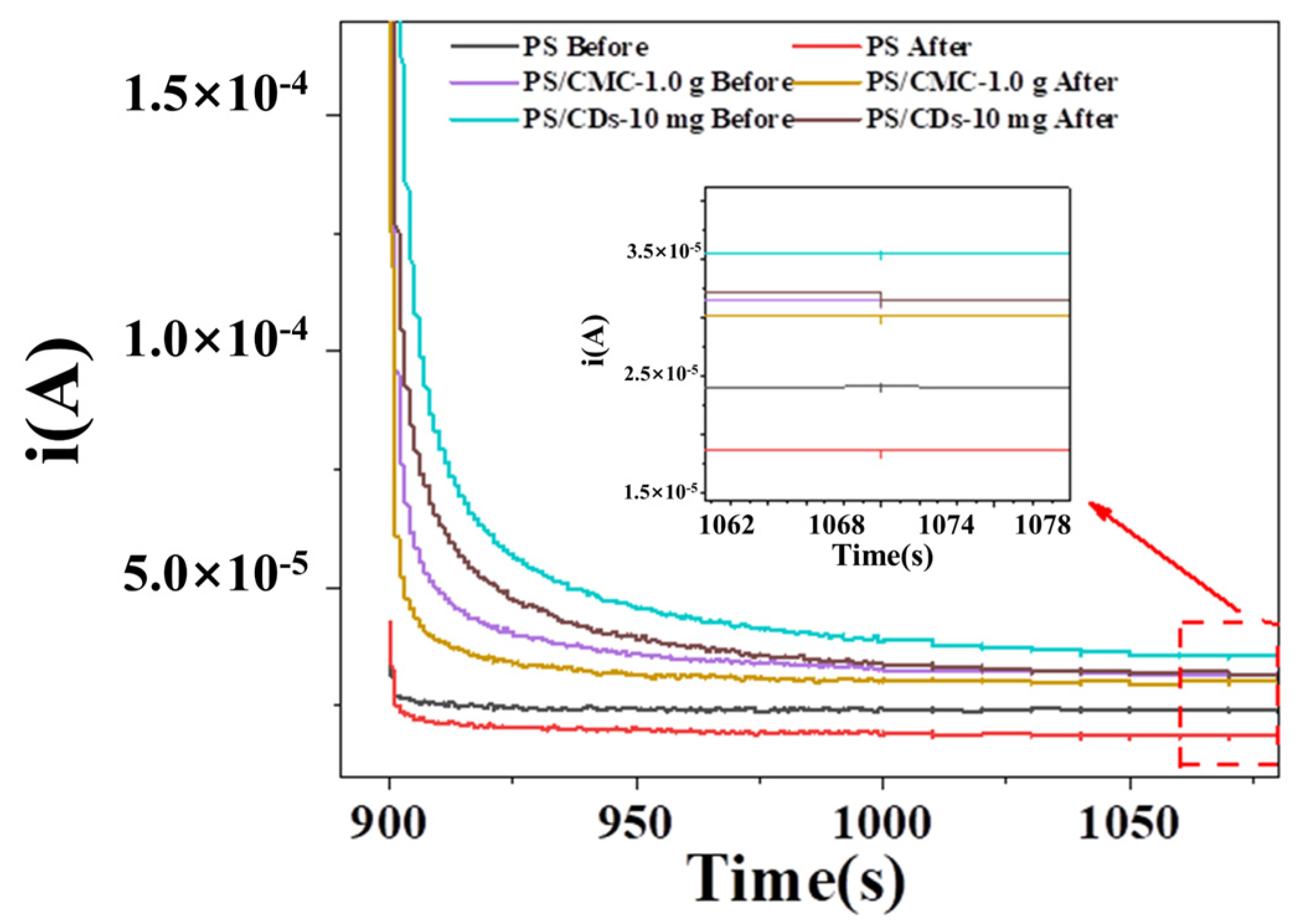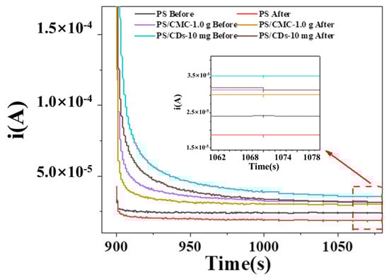Figure 7). The steady-state current of the pristine PS film measured 2.39 × 10