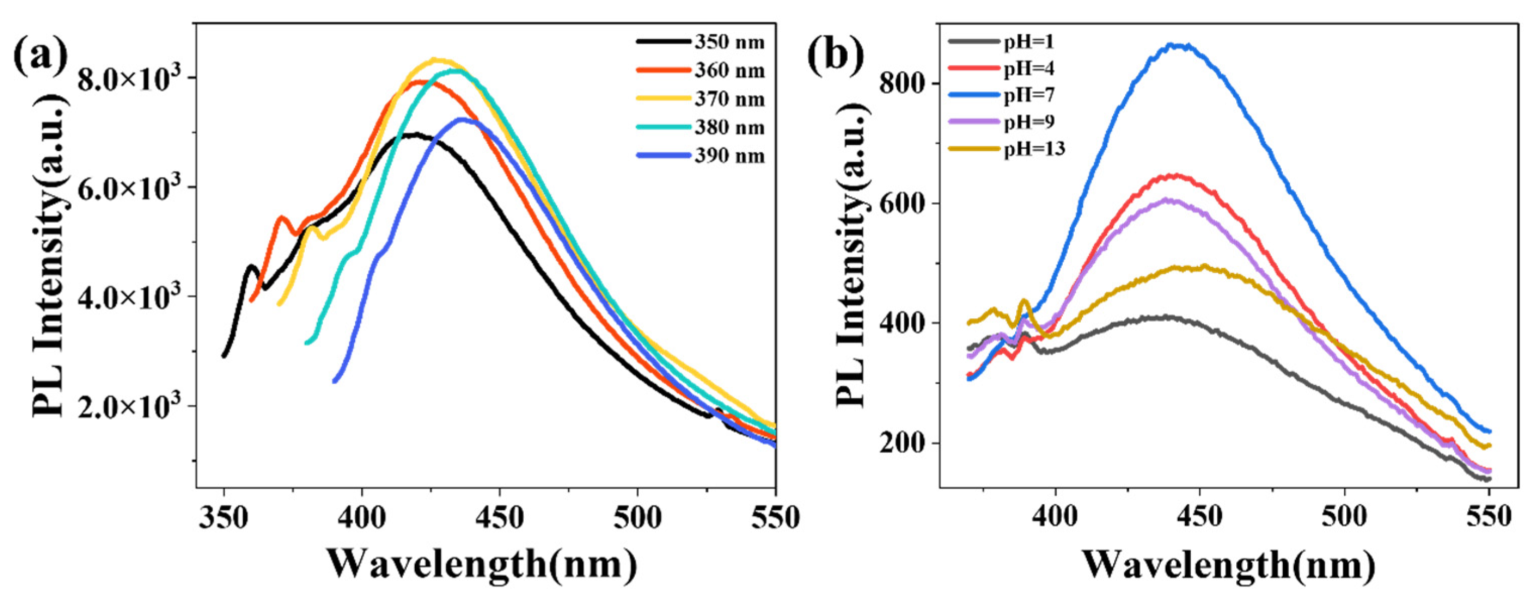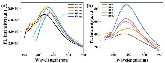 Figure 8a) showed a gradual red shift in the emission maximum as the excitation wavelength increased from 350 to 390 nm, with the fluorescence intensity first increasing and then decreasing. The most intense blue emission was observed at 427 nm under an excitation wavelength of 370 nm.pH-dependent fluorescence measurements (