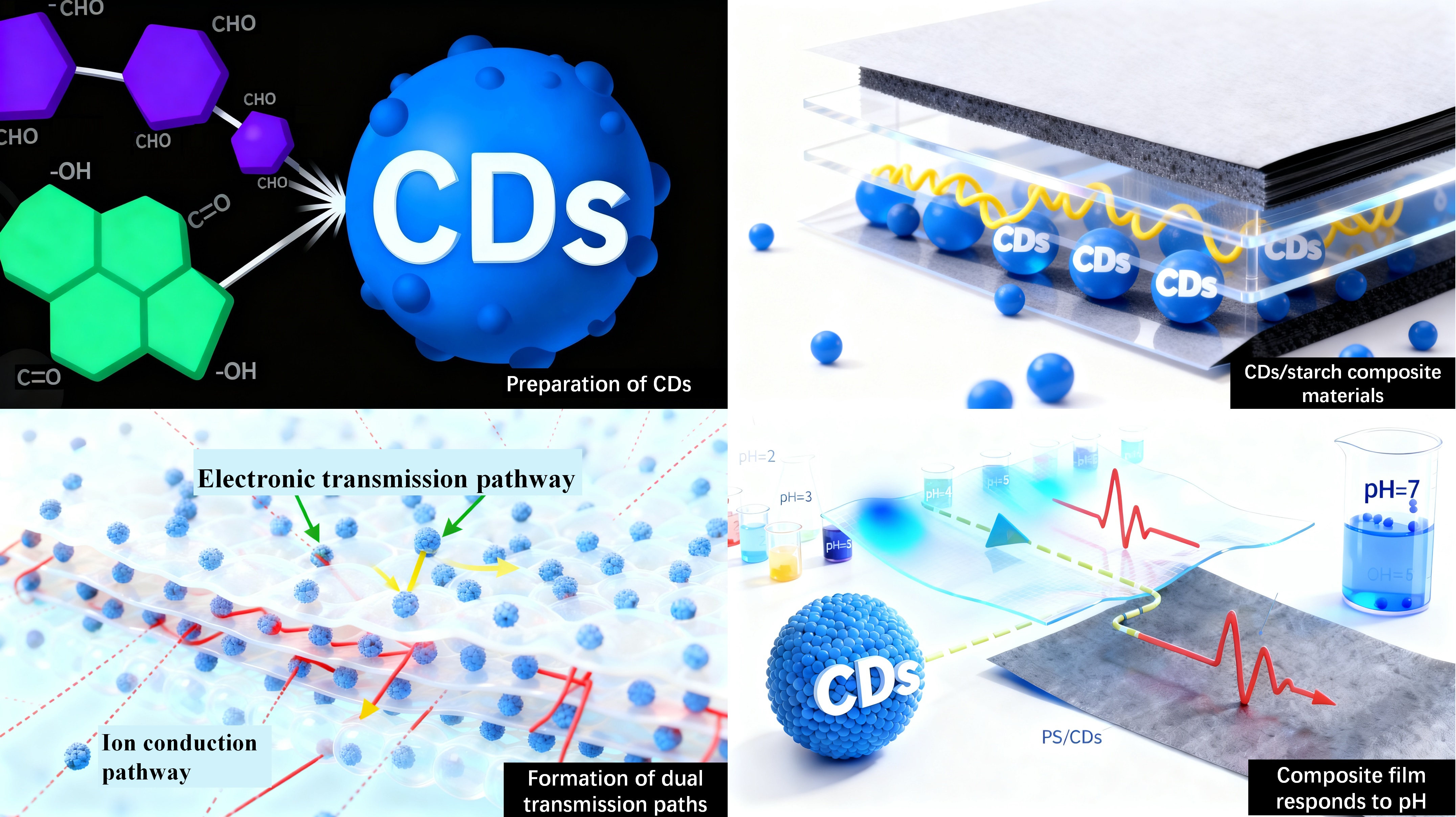 Based on the above background, this work systematically investigates the effects of three modifiers—Ag+, carboxymethyl cellulose (CMC), and carbon dots (CDs)—on the structure and properties of phosphate starch (PS) films. Emphasis is placed on the role of CDs as flexible nano-crosslinkers that interact with the PS matrix via hydrogen bonding, leading to a balanced strength–toughness performance. Furthermore, this study elucidates the critical contribution of the conjugated architectures formed between phosphate groups and CDs in establishing synergistic ion–electron transport channels, which significantly reduce film impedance and impart sensitive dual-mode current/fluorescence responses to pH variation. These findings provide a new design strategy and theoretical support for developing high-performance multifunctional starch-based sensing materials toward smart packaging applications.