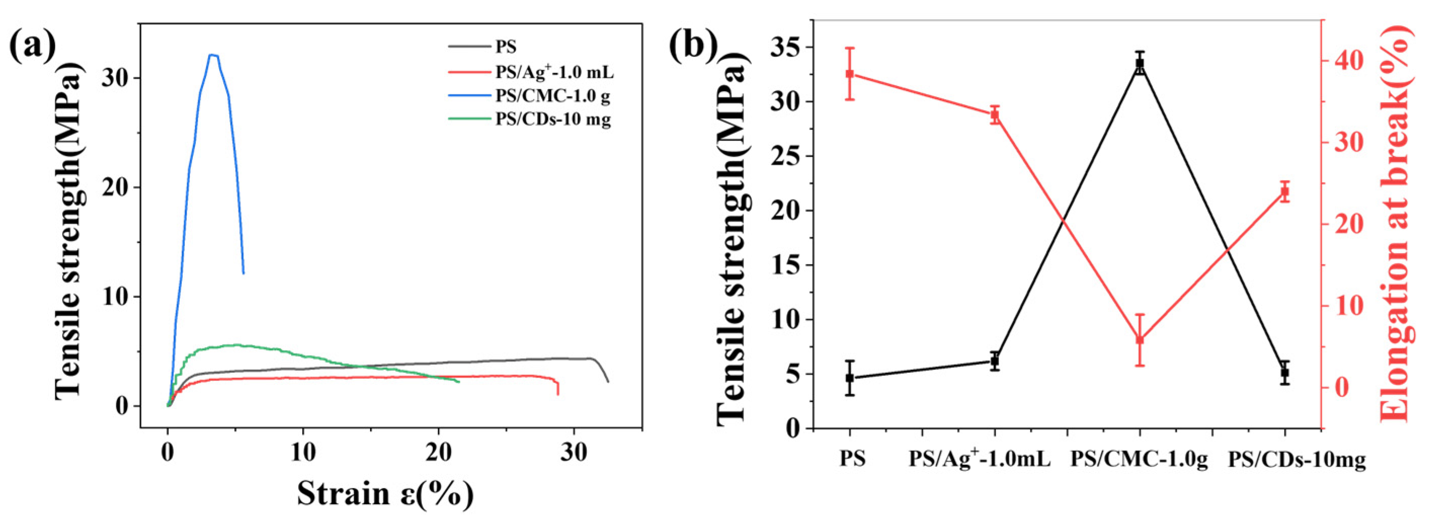 + and phosphate groups, which enhances stress transfer but restricts molecular chain mobility. The PS/CMC composite demonstrated the highest tensile strength (33.5 MPa), but its elongation at break dropped sharply to 5.8% (