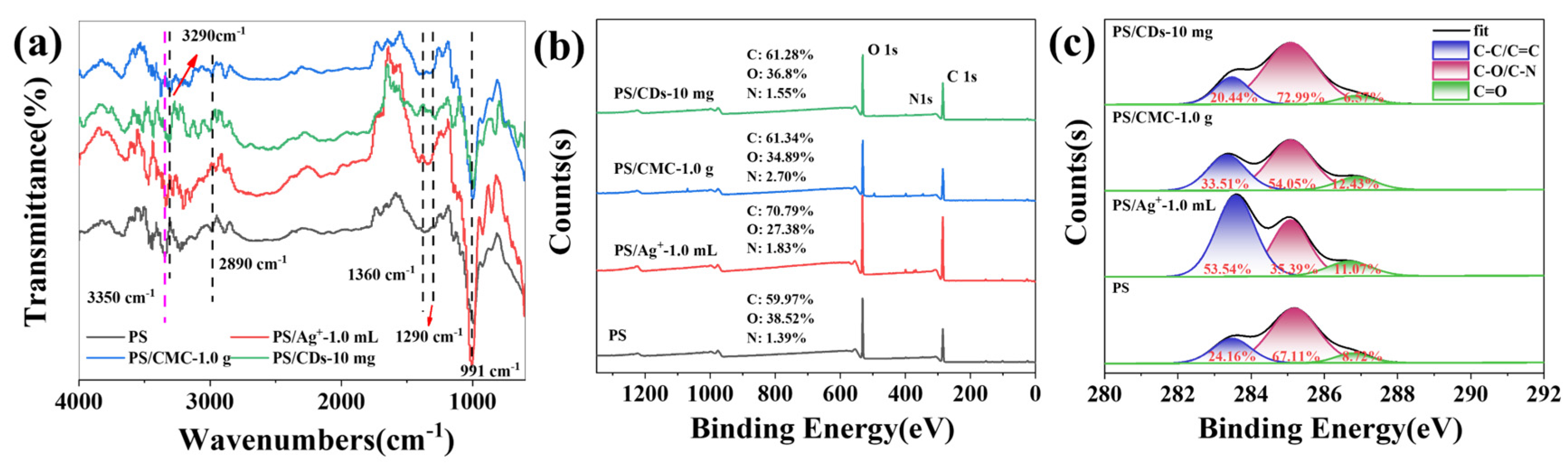 XPS analysis provided further insight into the chemical composition changes in the composite films. The PS/CMC film showed an increase in C–C content from 24.16% to 33.51% and a rise in C=O content to 12.43% (