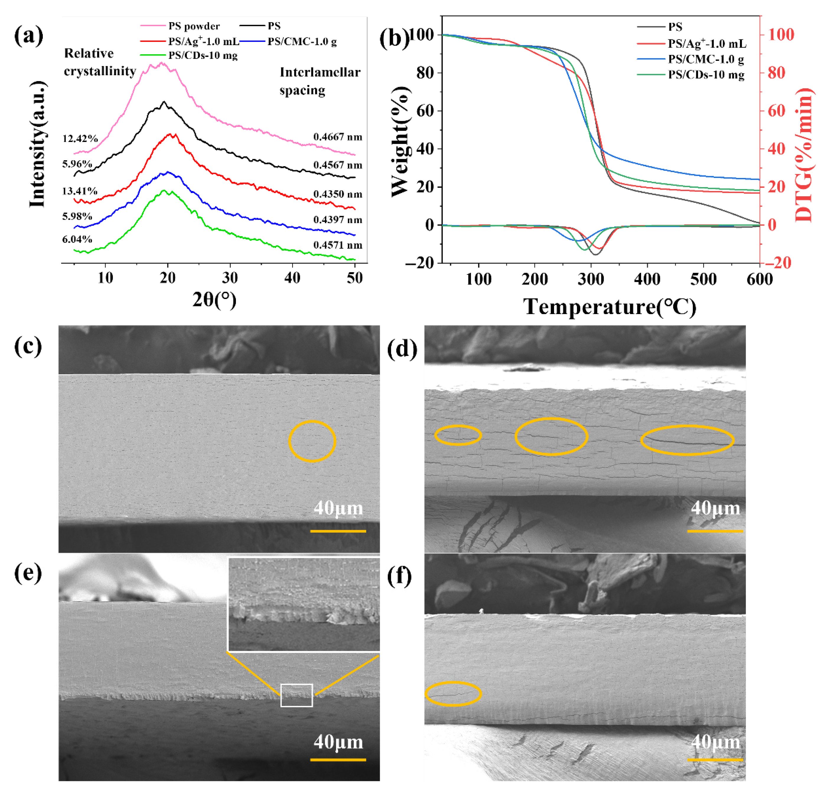 + composite film increased to 13.41%, with its lattice spacing reduced to 0.4350 nm (compared to 0.4667 nm for the pure PS film). This enhancement is attributed to coordination interactions between Ag