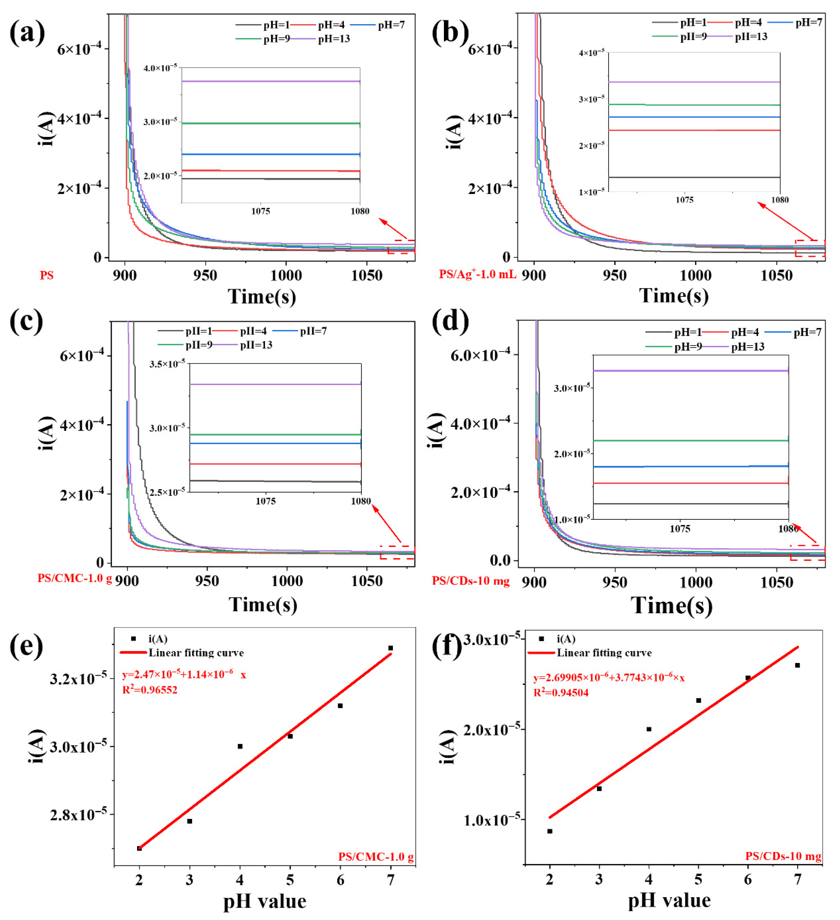 Over the acidic pH range of 2–7, the PS/CMC and PS/CDs composite films display a strong linear correlation between current and pH value. The fitted linear equations yield determination coefficients (