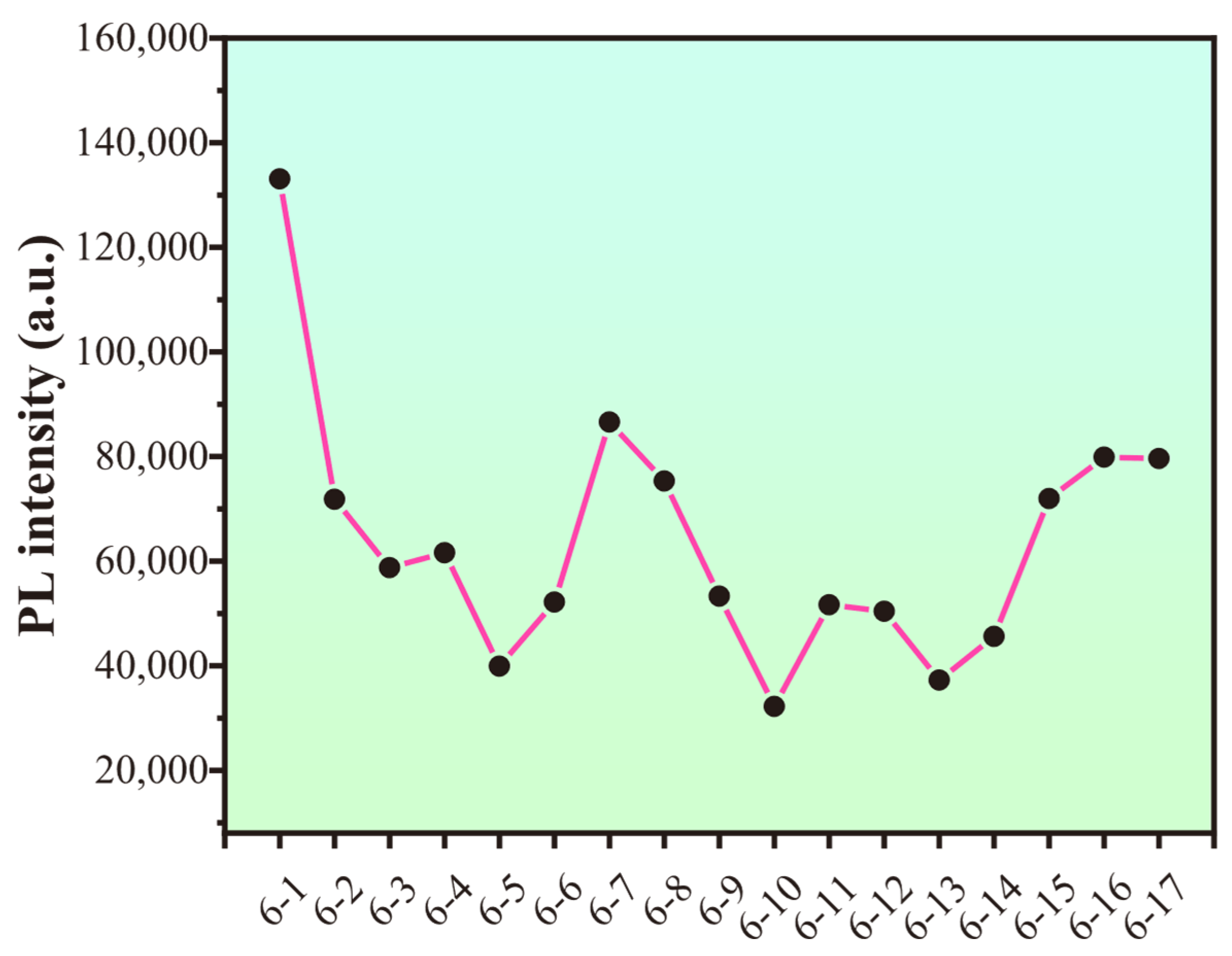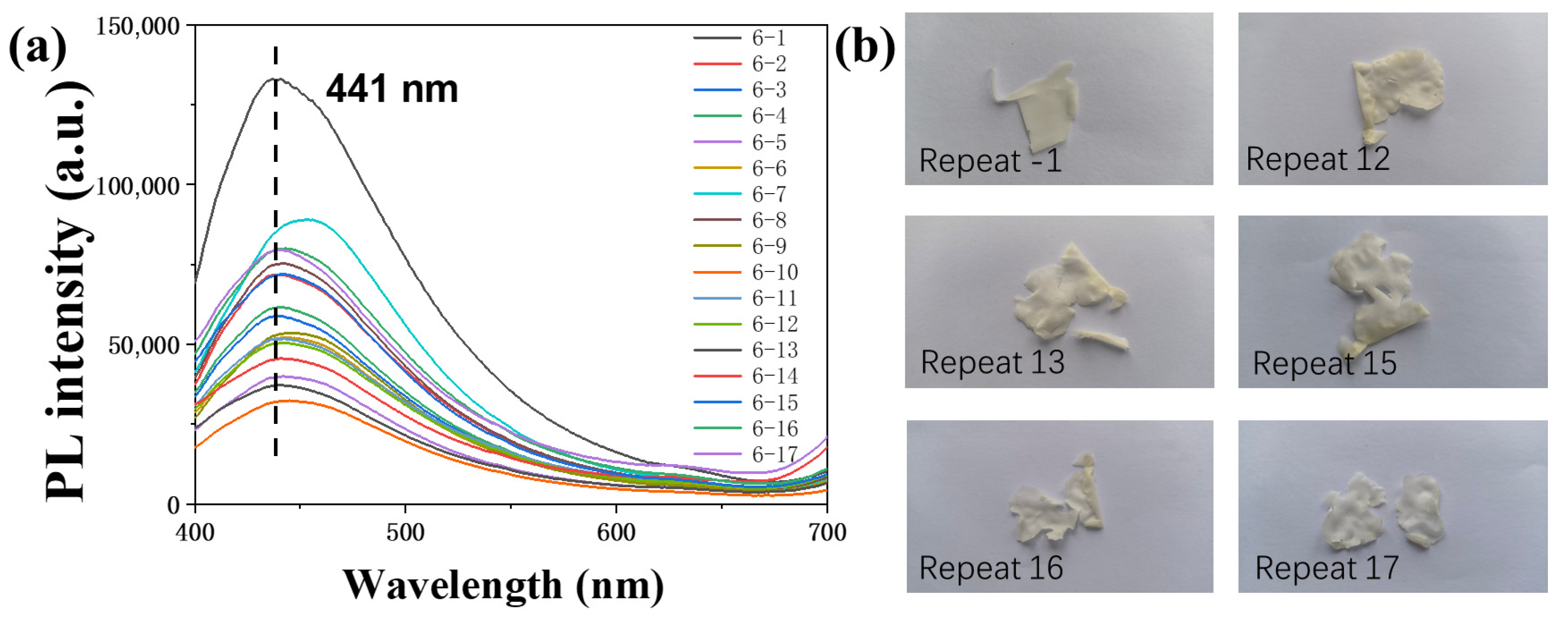 Figure 9), at which point the material had softened excessively and the experiment was terminated. The fluorescence intensity showed a correlation with the number of cycles, exhibiting a general declining trend as testing progressed (
