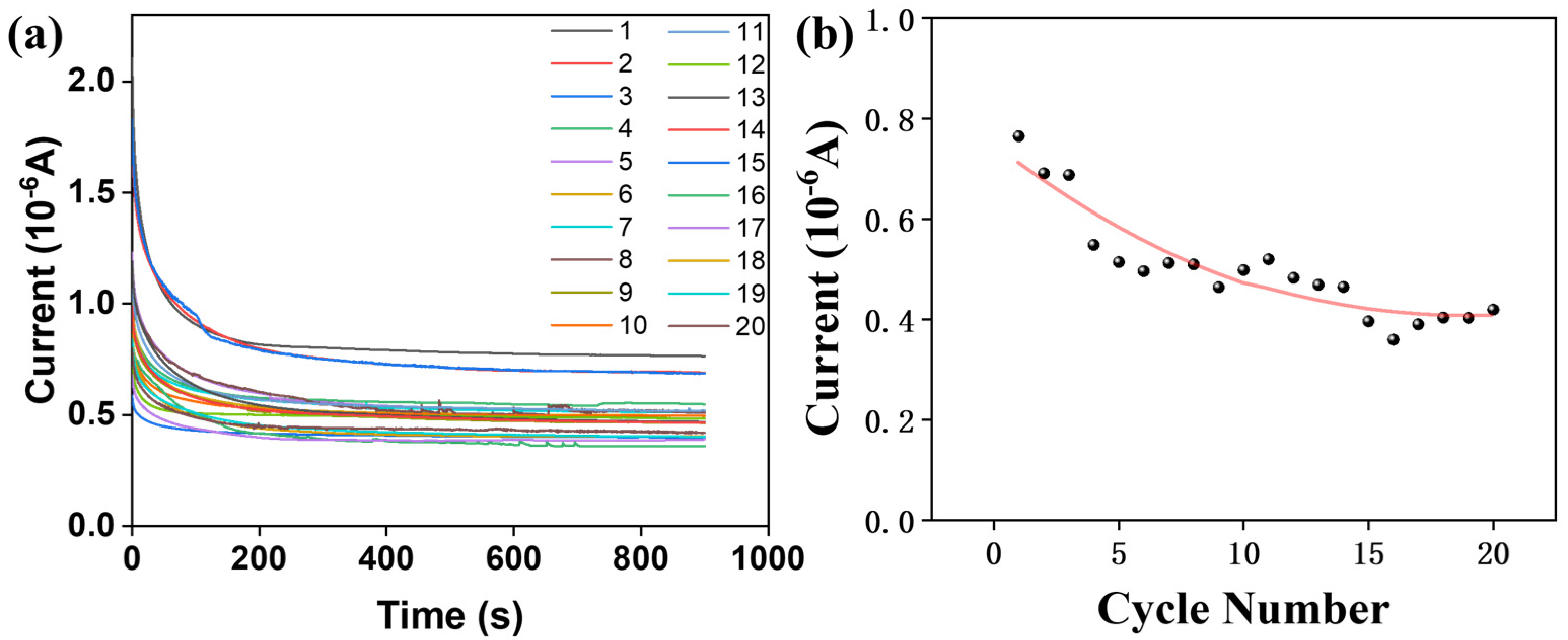 Figure 11a). For the PS/CDs composite film, the electrical signal decreased progressively with an increasing number of cycles (